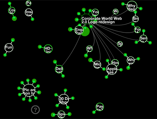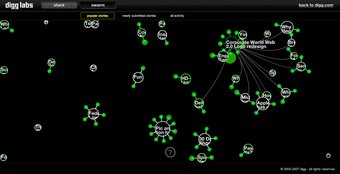 For me social software is like „Pretty and Smart girls bringin‘ in their numbers and me connecting with them when I appreciate it.“ That does manifest some real improvement compared to my real life and makes the world a lot smaller while increasing the range of possibilities. An interesting text about people connecting was mentioned right here in this weblog several months ago. It is the text of Thierry Crouzet and his book „Le Peuple des Connecteurs“ which also compares the process of connecting to telephonists aka operators. In the end my Weblog-area called „Konnektoren“ reflects just the list of „numbers“ of people to dial, which is a public list. :-D It is very nice that these connections can even be made visible. Ideas how this might look like can be seen at VisualComplexity. If you take a walk over to digg-labs you can see DIGG Swarm full of life in full live action (see picture/screenshot above).