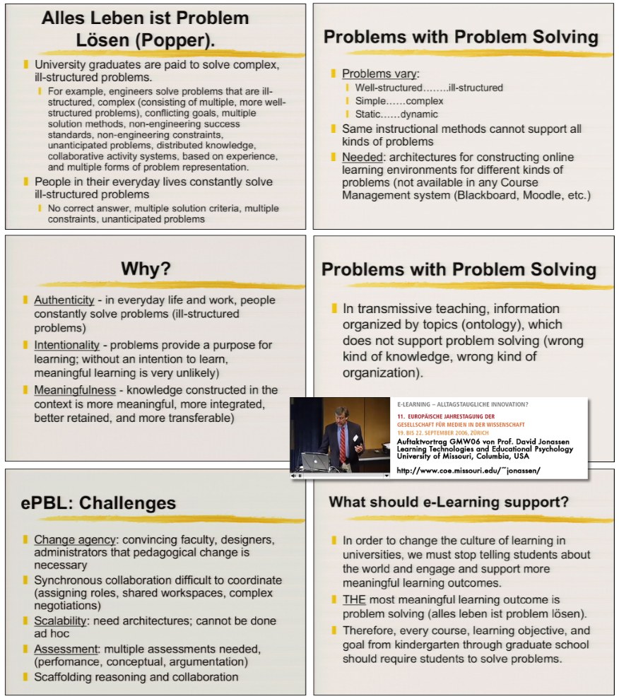 Grafische Zusammenfassung des Vortrags von Prof. David Jonassen, Learning Technologies and Educational Psychology, University of Missouri, Columbia, USA zum Thema „e-Problem Based Learning: An Emerging Paradigm“. Die gezeigten Folien sind von mir ausgewählte und zusammengefasste Bildschirmfotos aus der Live-Übertragung der Keynote und stammen vom Professor Jonassen.
