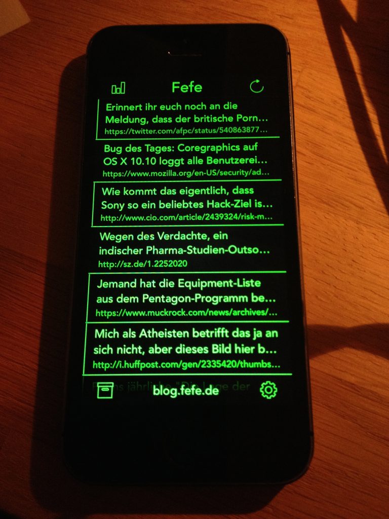 Als ich zum Zeitpunkt des 27c3 ein Jahr später Langeweile hatte, begann ich während wir mit einigen CCC’lern dem 27c3 per Videostream beiwohnten, eine kleine iOS App zu basteln, die Inhalte von Fefe’s Blog per RSS-Feed abholen und anzeigen sollte. Die erste primitive Version funktionierte bereits gegen Ende des 27c3 auf meinem Development iDevice, damals noch ein iPhone 3GS.