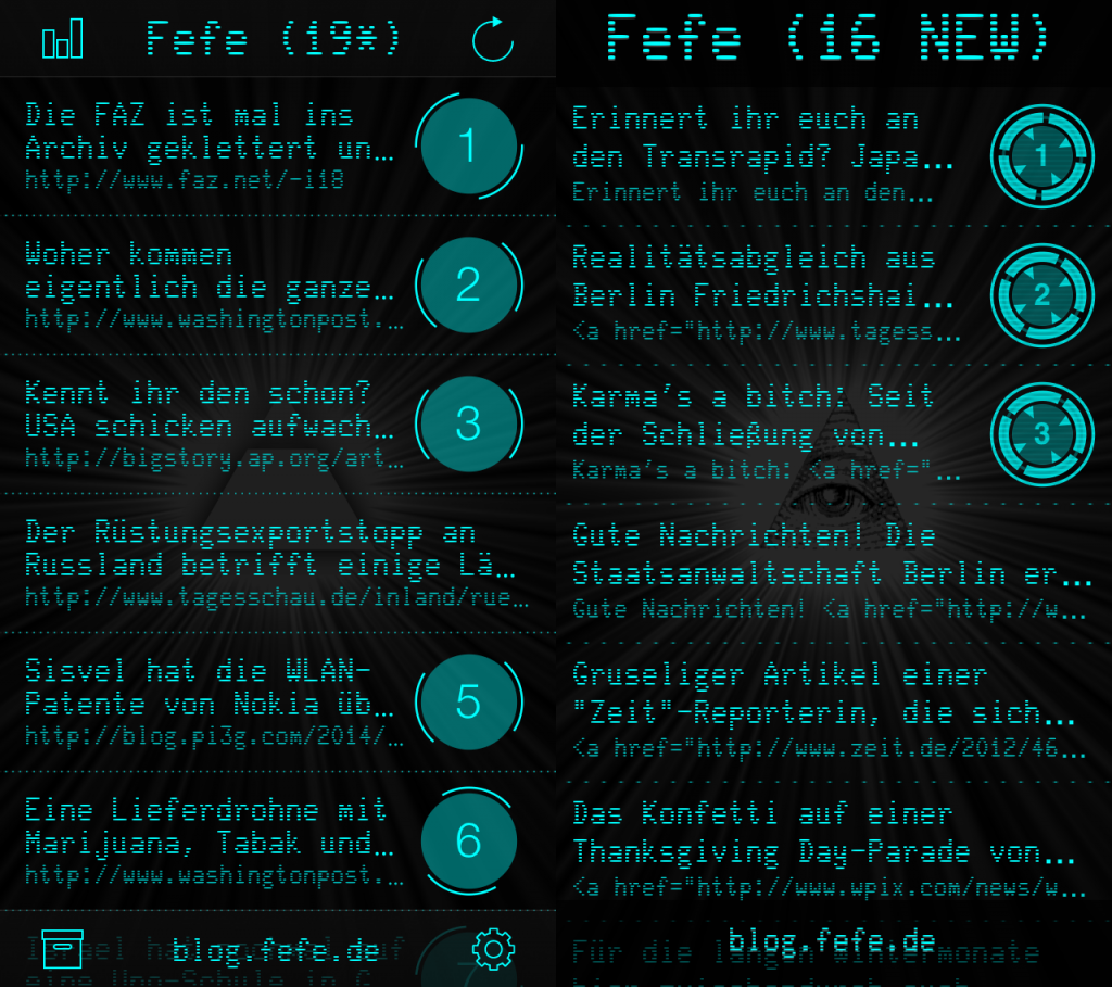 All diese runden Gebilde drehte sich in sich selbst und es gab ein herrlich dynamisches Gesamtbild. Man beachte, dass es zu dieser Zeit Kommentare zu Fefe’s Blog gab über eine nicht zum Blog selbst gehörende URL als Service refefe (http://blog.refefe.de/rss.xml). Das heisst Leute konnten da extern kommentieren und als ich das mitbekommen hatte, hab ich die Kommentare natürlich ebenfalls in der App angezeigt.