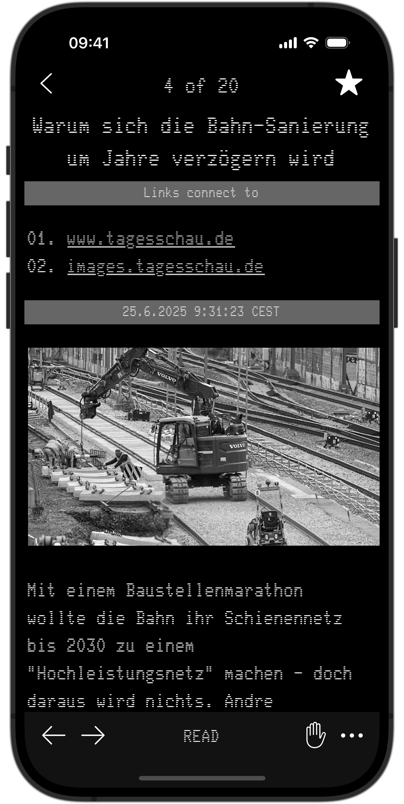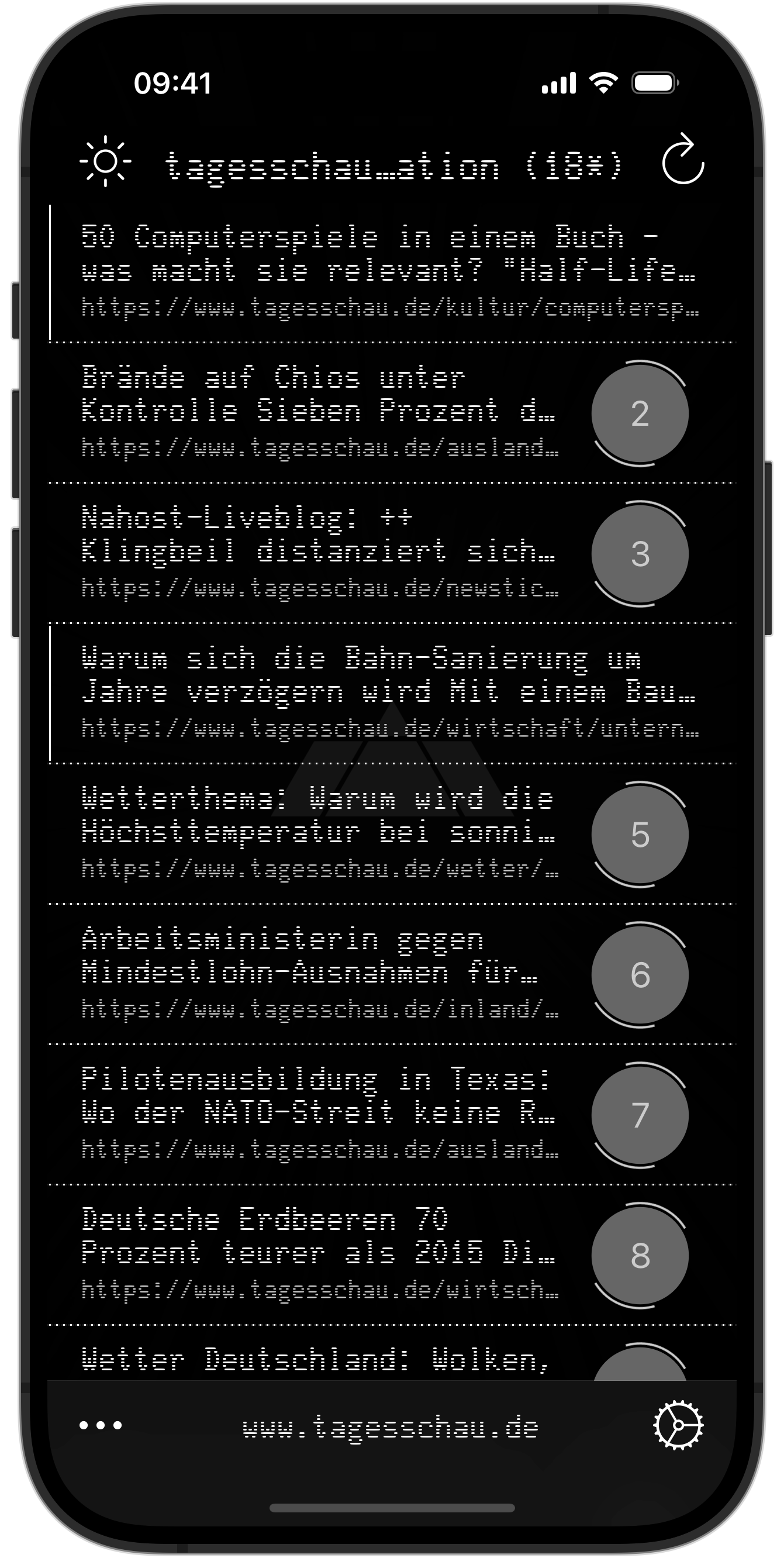 - Ich hab noch keine gute Loesung gefunden, dass nicht „komischer Content“ in der WebView gerendert wird. Viele RSS feeds liefern HTML aus. Das kann sonstwas sein, auch heftig ungueltiges HTML und mit Werbung und iframes vollgeklopptes HTML. Sowas will man nicht rendern lassen. Daher filtere ich das HTML aktuell etwas grobschlaechtig mit der Search-and-Replace und der RegEx-kill-HTML-Tag-Container-Axt. Das geht sicher etwas smarter.