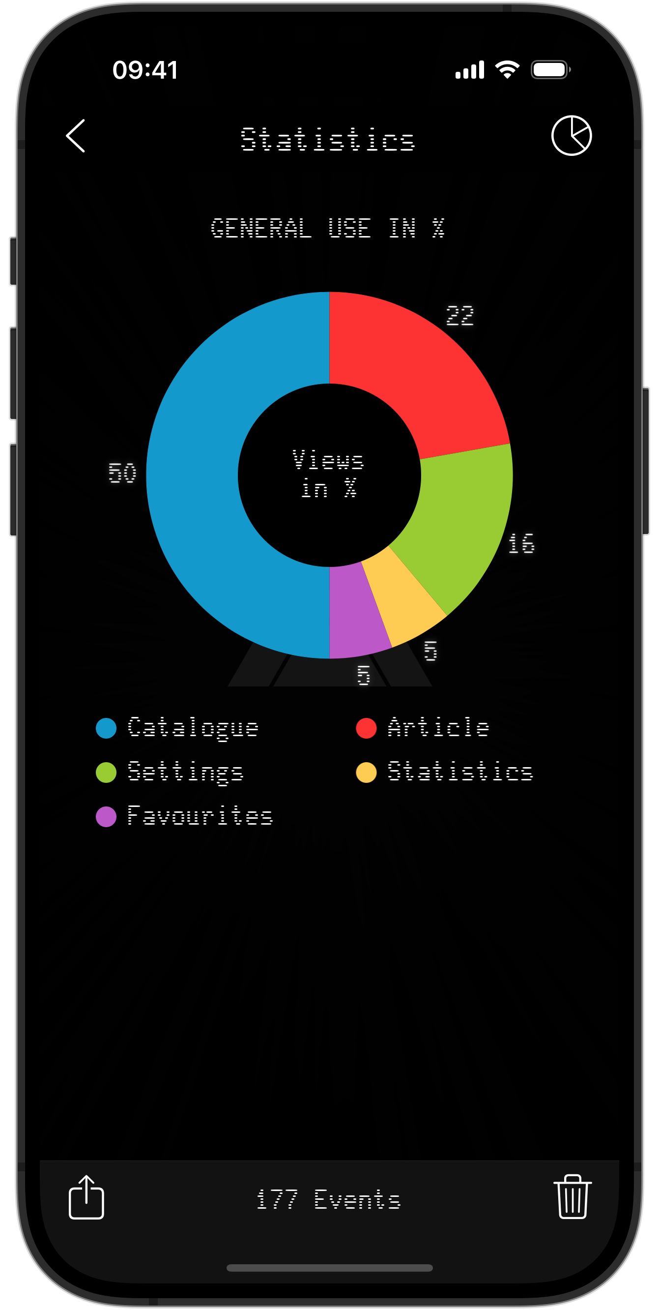 Ein weiteres schönes Feature, was gar nicht so trivial zu implementieren war, war die Statistik. Die App hat auf Wunsch eine Statistik über Verweilzeiten und Abrufzahlen geführt und ausschließlich lokal gespeichert (da wurde auch nie irgendwas aus der App jemals „nach Hause telefoniert“). Diese Statistik wurde dann fein in einem Tortendiagramm animiert aufbereitet. Es kann zuweilen erschrecken wenn einem die Statistik belegt, wieviel Lebenszeit man der App gewidmet hat. Ich werde meine persönliche Nutzungsstatistik weiter unten in meinem Fazit veröffentlichen.