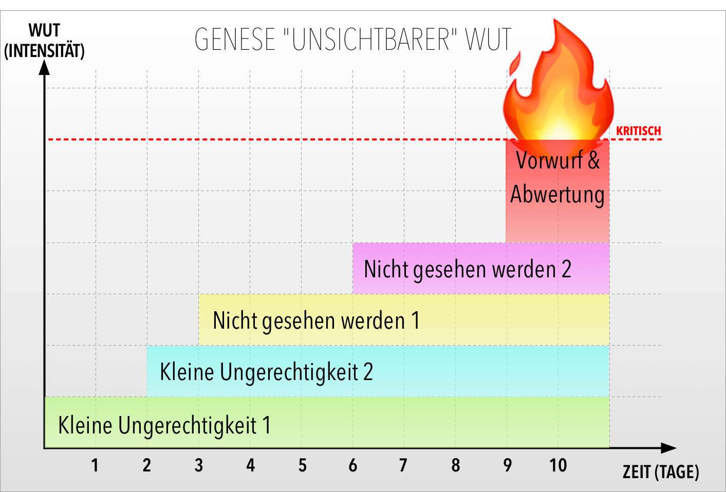 Schaut man sich die Genese der Wut an – die ich hier mal exemplarisch aufgebracht habe, weil fast jeder sich oder andere da gut wiedererkennen kann – dann erkennt man, dass das Problem deutlich früher beginnt. Die anfänglichen Gefühle, „eine kleine Ungerechtigkeit“, ein kleines „nicht gesehen werden“ oder ein „Vorwurf der im Nebensatz“ fallengelassen wird die für sich behalten werden und somit unsichtbar bleiben, die sammeln sich über die Zeit an. Ich denke, dass die Intensität der Wahrnehmung bzw. wieviel „Raum“ der Ärger oder die Missachtung einnimmt zwar grösser wird, wenn etwas Neues hinzu kommt, aber käme nichts Neues hinzu, dann würde sie peu a peu wieder das Normale Null-Niveau einstellen. Man vergisst den Ärger, er ist nicht mehr so wichtig oder auch „verraucht“.