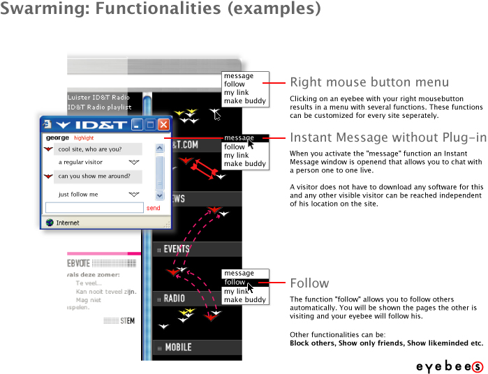 Lluna installiert Zusatzkomponenten auf dem eigenen Computer, die permanent überwachen, welche Seiten man ansurft, ein zentraler Server des Dienstleisters prüft dann welche anderen Personen gerade die gleiche Web-Adresse im Browser anschauen wie man selbst. Diese Personen werden dann mit einem Icon bzw. einer Avatar-Figur unten am Bildrand der Webseite wie Fussgänger angezeigt. Doppelklickt man auf die Figuren, kann man sofort einen spontanen Chat mit diesen beginnen. Diese Software stellt so ein Gefühl von „Präsenz“ anderer Menschen im Web her. Ähnliches hat eyebees versucht im Jahre 2003 (siehe Screenshots rechts; anklicken für grosse Darstellung).