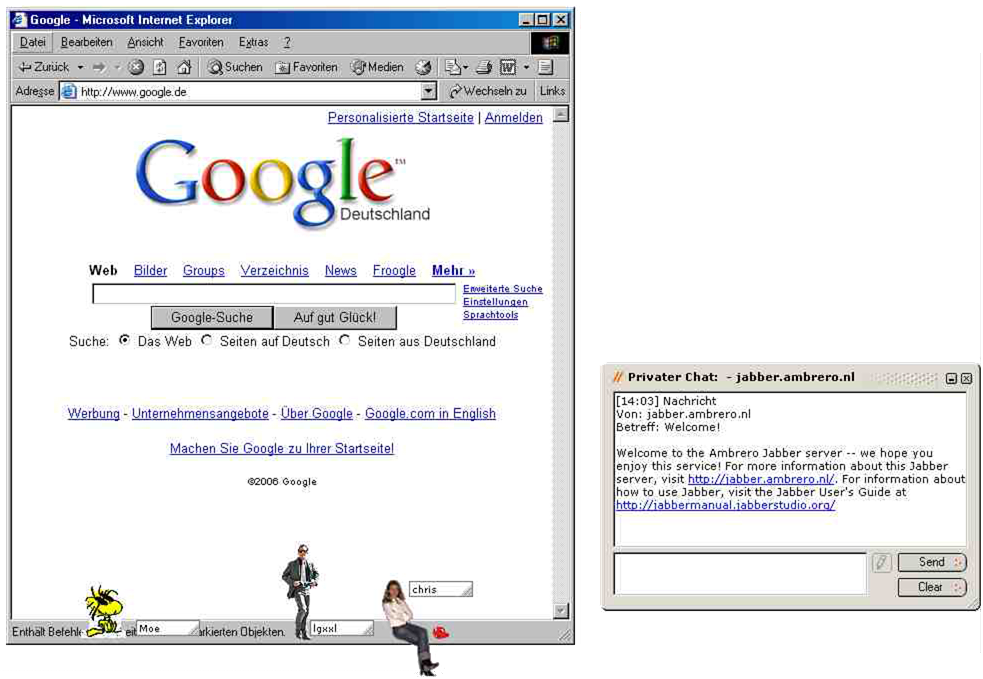 Präsenztechnologien machen die Awareness (das Sein) der Menschen auf den Webseiten sichtbar (die Wahrnehmung) und stellen geeignete Kommunikatiosmöglichkeiten zur Verfügung. Die Open Source Technologie des „Jabber Virtual Presence Project“ ist eine dieser Präsenz Technologien. Sie zeigt menschliche Figuren direkt auf der Webseite an. Die Figuren sind wenige Zentimeter groß (96 Pixel hoch) und stehen auf einer ansonsten transparenten Ebene über der Webseite auf dem unteren Rand des Browsers.